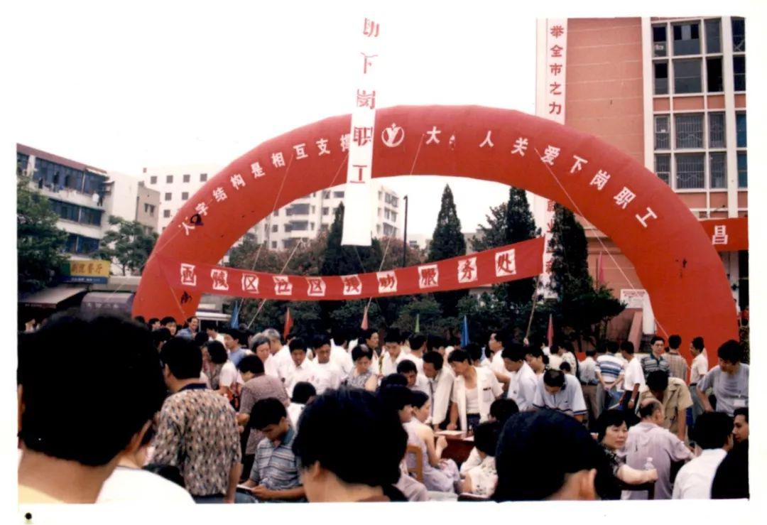 ▲1995年,在西陵剧场门前开展再就业工程援助活动