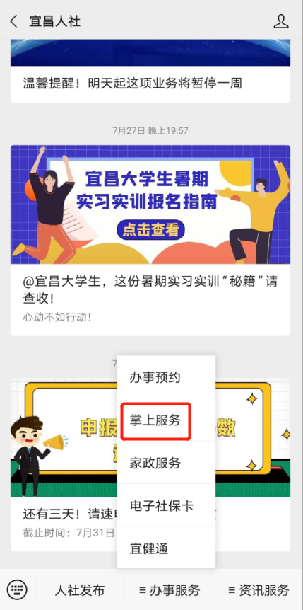 第一步:关注“宜昌人社”微信公众号,点击“办事服务”—“掌上服务”。
