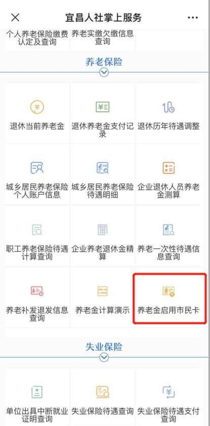 第二步:进入宜昌人社掌上服务,点击养老保险—“养老金启用市民卡”。