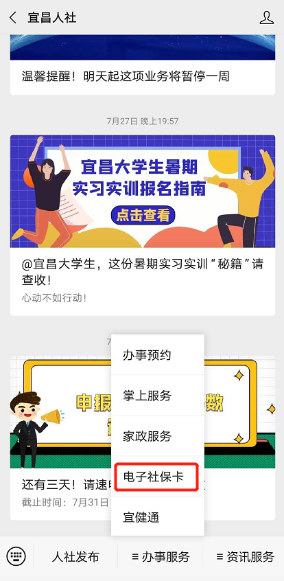1、操作之前,请您按照提示在“宜昌人社”签发“电子社保卡”。