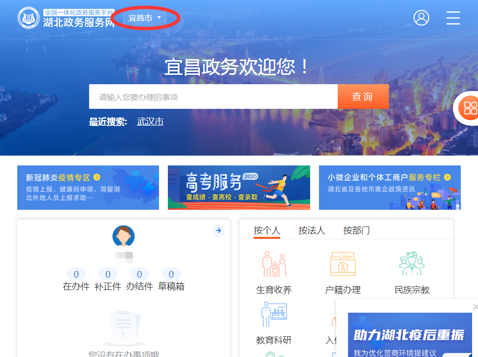 1. 登录“湖北政务服务网”(先注册),“城市”选择“宜昌市”。