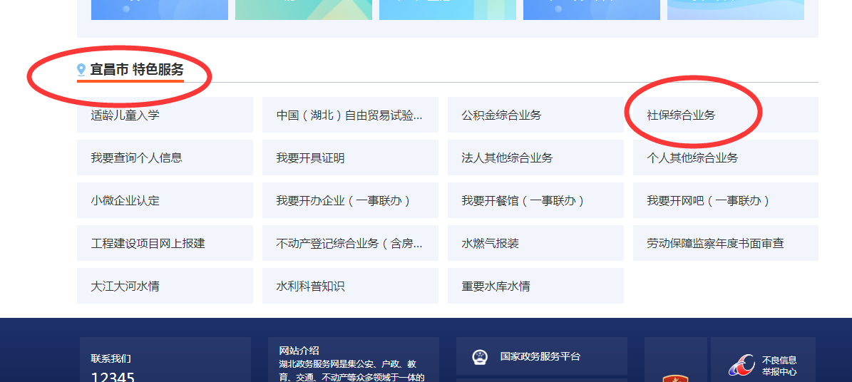 2.下滑主页面至页末,找到“宜昌市特色服务”栏,点击“社保综合业务”。