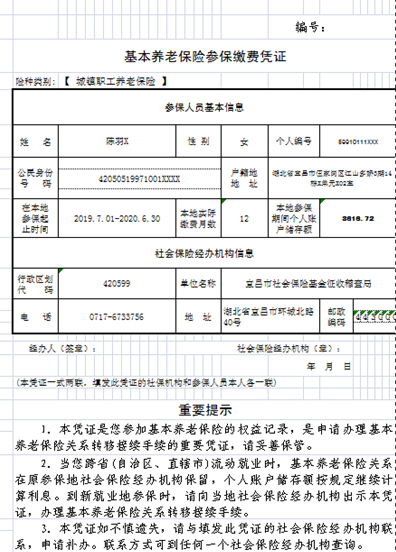 市社保征稽局工作人员解释,参保人员在办理养老保险关系转出时(从宜昌转到外地),需要开具参保人在宜昌的参保凭证,即《基本养老保险参保缴费凭证》,交给转入地社保经办部门。
