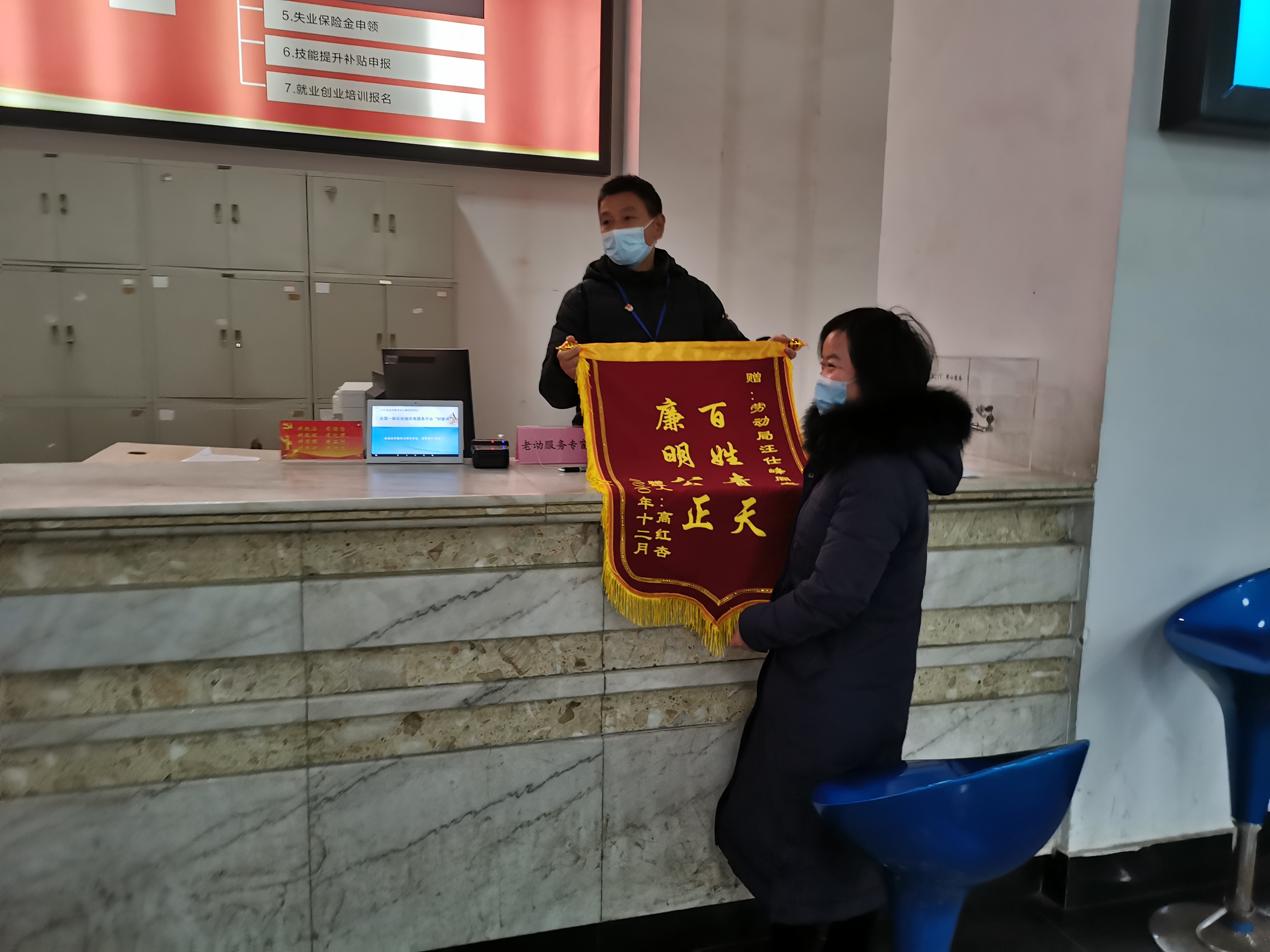 “你的耐心服务让我很感动,帮了我的大忙,谢谢!” 12月14日,高女士来到市就业局公共就业一窗式帮办服务区将一面锦旗送到窗口工作人员汪仕峰手中。原来高女士前几天到窗口办理失业保险金相关业务,汪仕峰热情接待了她,耐心为她办理了业务,让她倍感舒心。据高女士介绍说,去年她陪同朋友来办理业务,也刚好是汪仕峰接待,她顺便咨询了一些政策,汪仕峰均耐心解答,这让她记忆犹新。