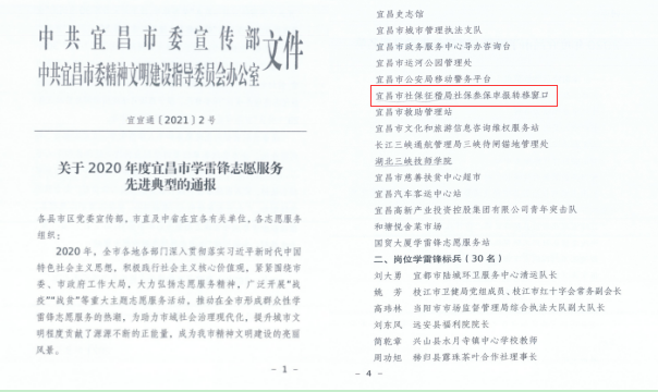 近日,市社保征稽局参保申报转移窗口被宜昌市委宣传部、市委精神文明建设指导委员会通报表彰为2020年度“学雷锋活动示范点”。