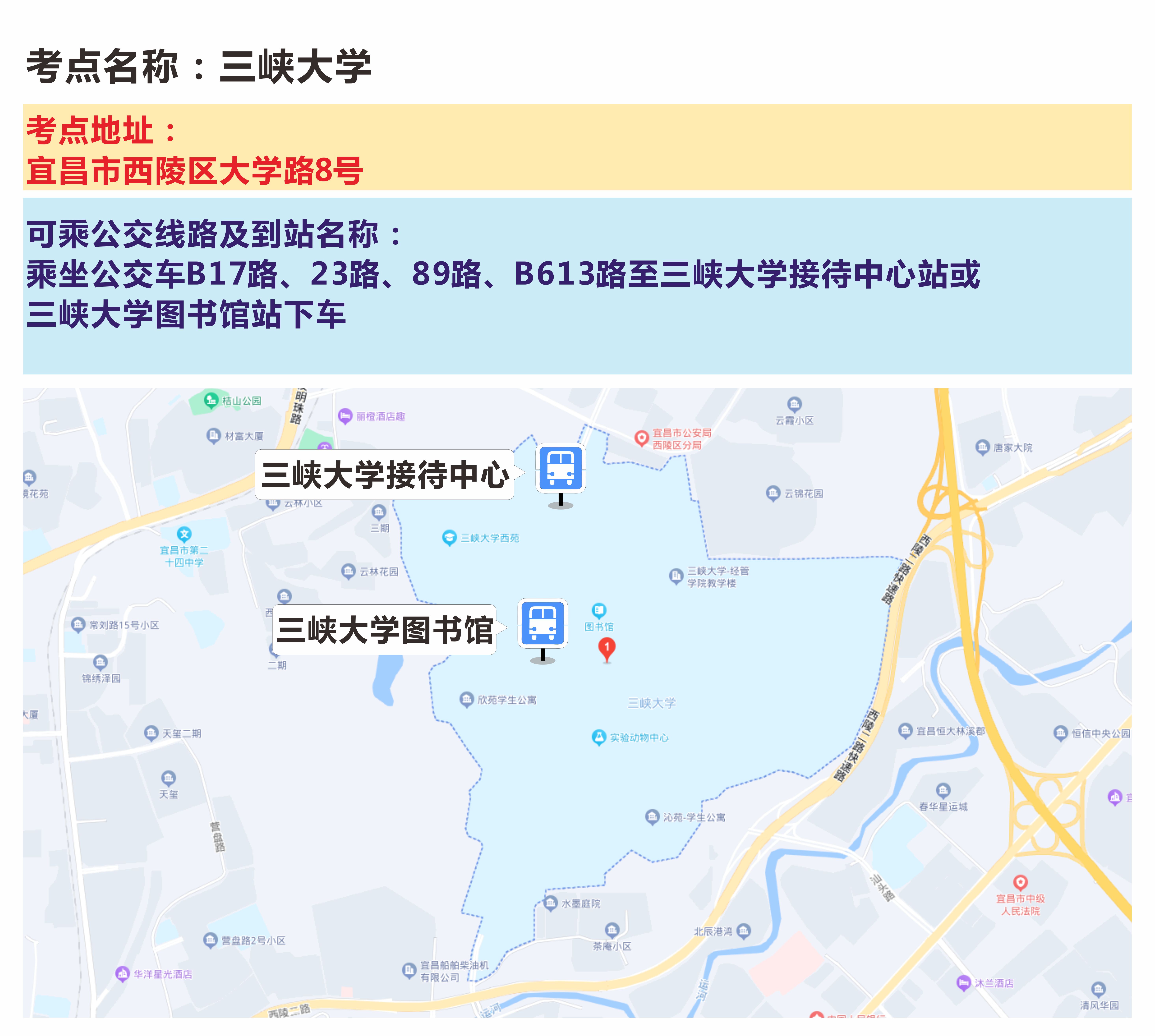 宜昌考区参考人数共计15188人。其中综合管理类(A类)4128人,设置3个考点138个考场;社会科学专技类(B类)4908人,设置3个考点164个考场;自然科学专技类(C类)3133人,设置3个考点105个考场;中小学教师类(D类)2022人,设置1个考点69个考场;医疗卫生类(E类)997人,设置1个考点36个考场。具体为(考点地图及公交线路附后):