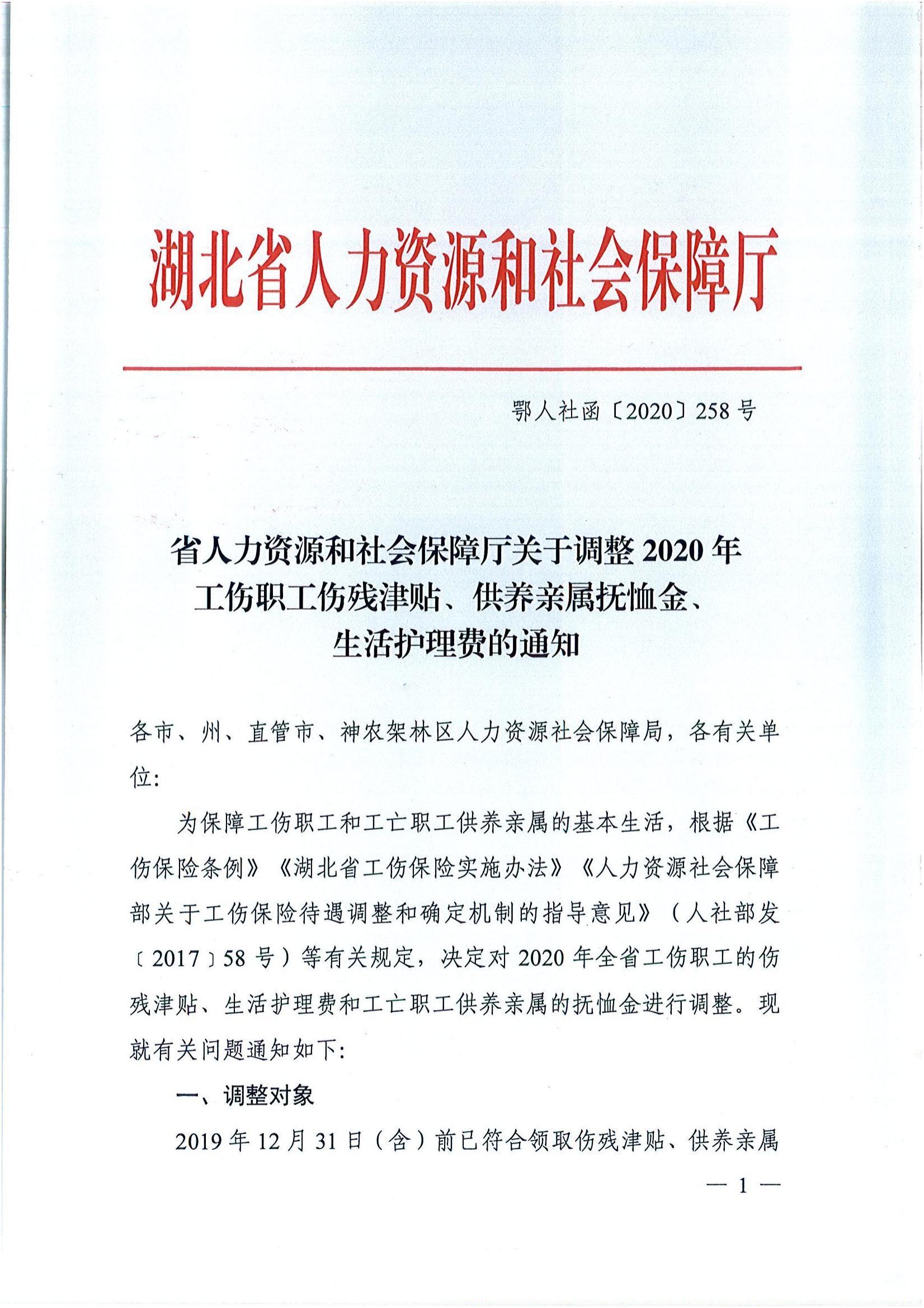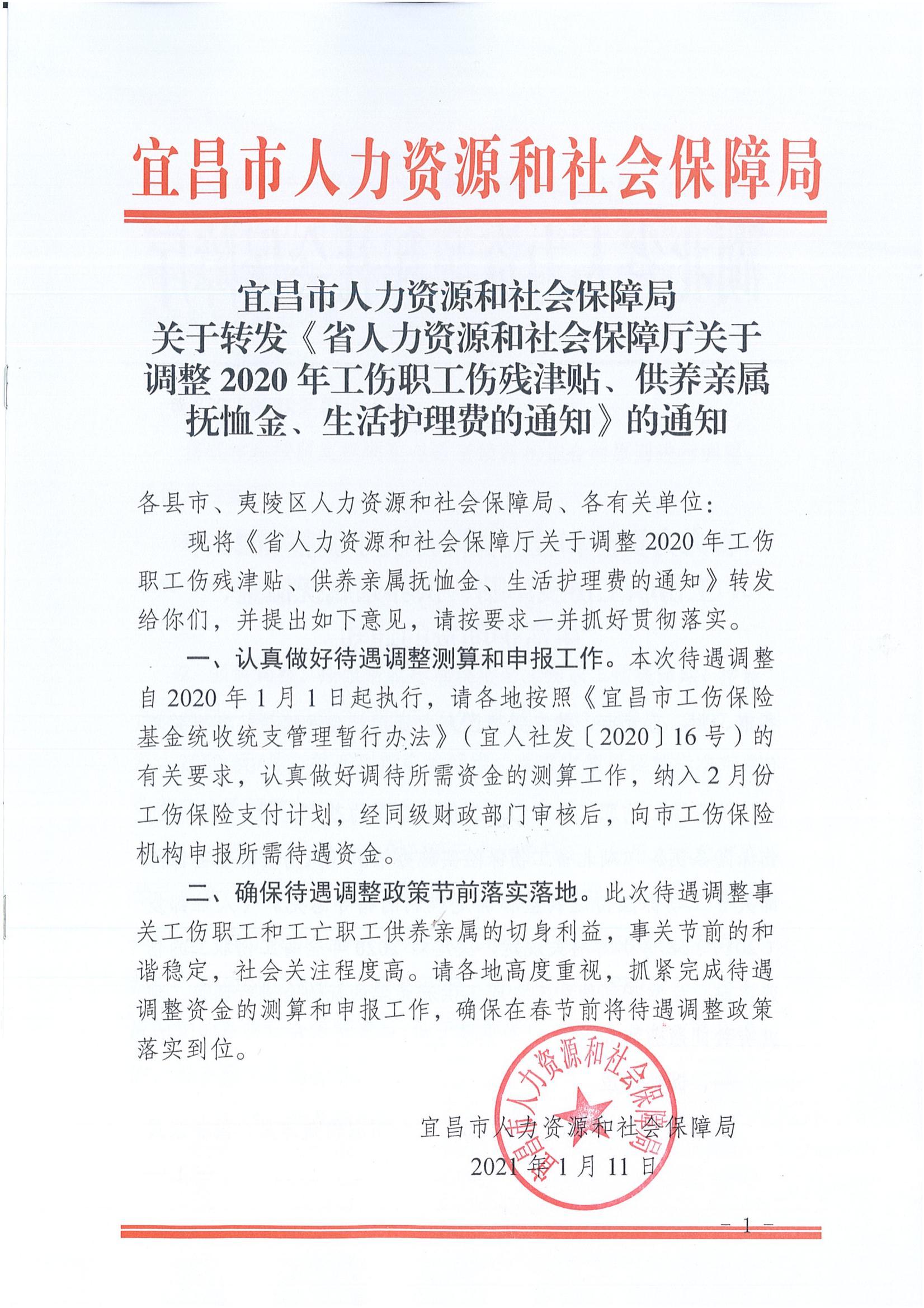 宜昌市人力资源和社会保障局关于转发《省人力资源和社会保障厅关于调整2020年工伤职工伤残津贴、供养亲属 抚恤金、生活护理费的通知》的通知