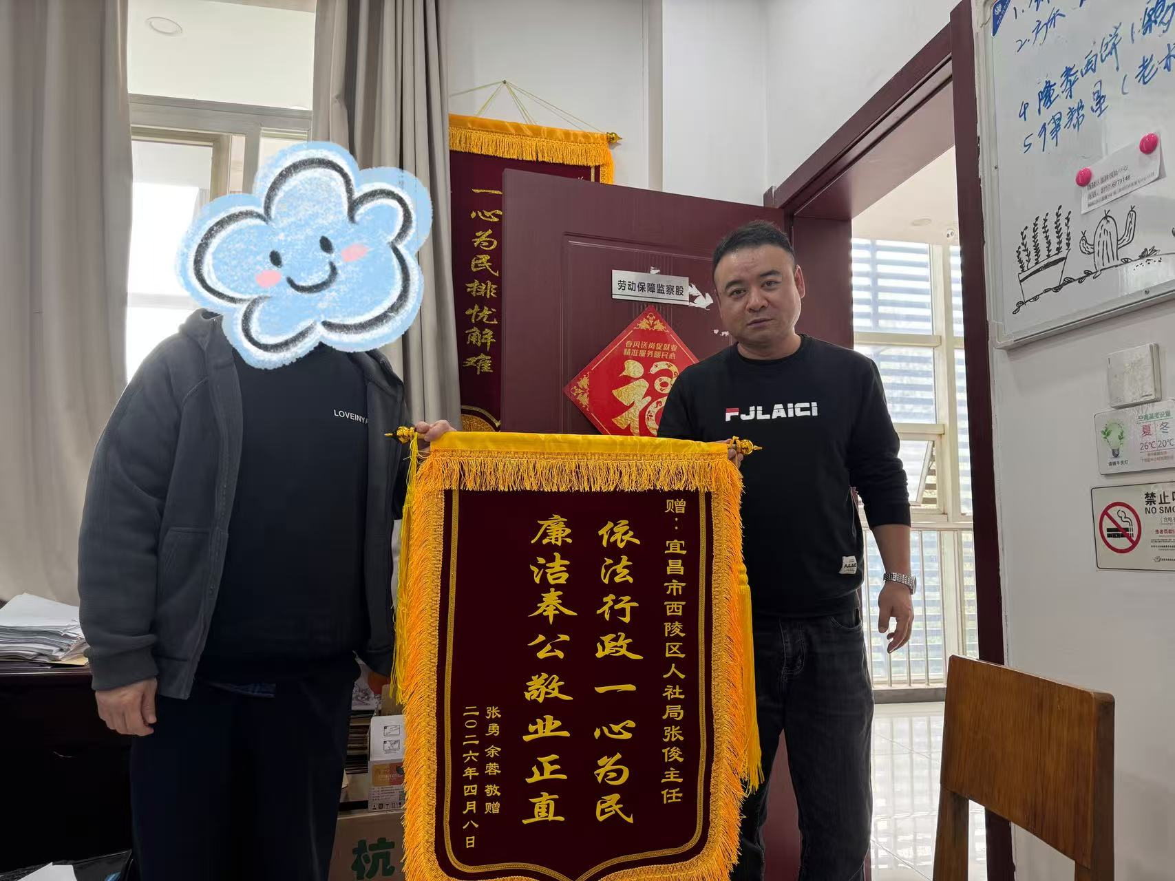 “真是太感谢你们了,要不是你们帮忙,这钱真不知道啥时候能要回来!”4月9日上午,两名劳动者先后来到西陵区人社局劳动监察部门,将两面印有“为人民服务、为百姓解忧”和“依法行政一心为民、廉洁奉公敬业正直”的锦旗送到工作人员手中,感谢他们为自己追回了被拖欠的工资。